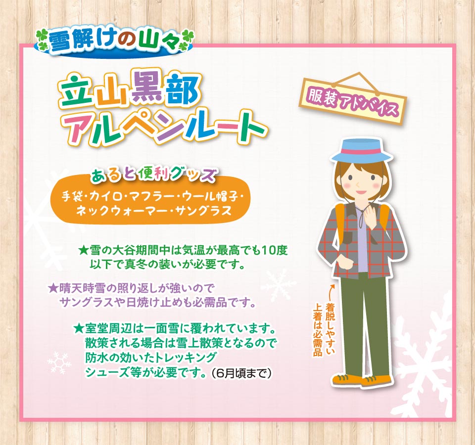 ・室堂周辺は一面雪に覆われています。散策される場合は雪上散策となりますので、防水の効いたトレッキングシューズ等があると良いです。(6月頃まで)